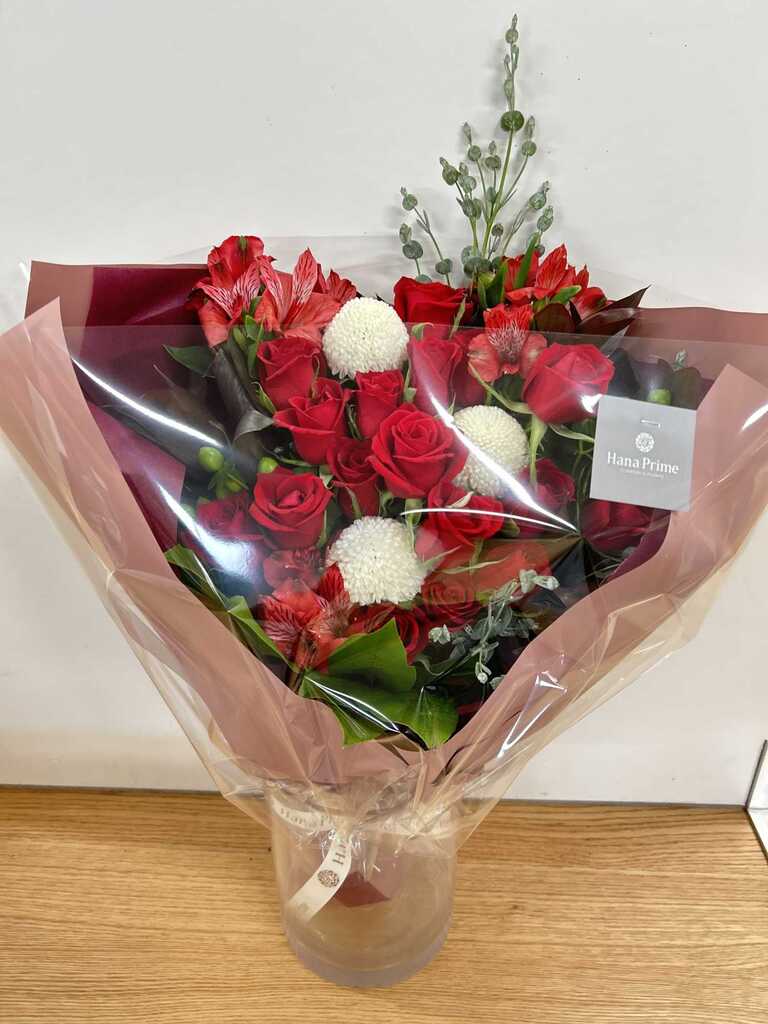 寄せ書き、赤いTシャツなど還暦カラーグッズ、花束をお渡ししました💐
